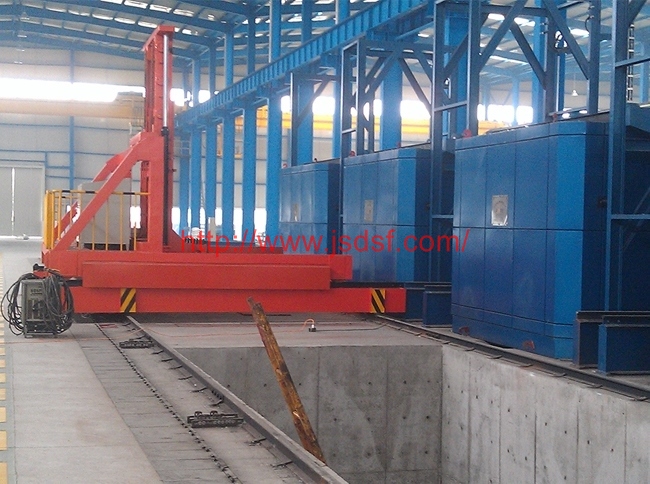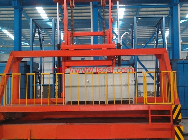 专用铲车设置于淬火炉前方,具有独立的轨道及传动装置,可以承载工件前后进出、左右平移及上下升降。一台铲车可供淬火炉和回火炉使用。