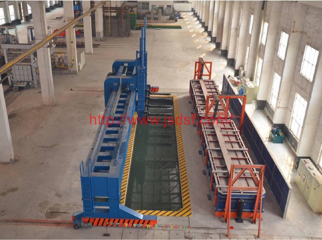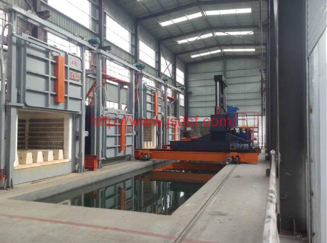 本套淬火机组有多台钟罩式电阻炉与一台淬火操作车组合为一个快速淬火机组生产线,一个机组可以根据用户的产量和工艺要求配套几台不同的炉型,炉子的数量和炉型可以自由组合,本生产线可满足不同的生产工艺如:淬火、回火、退火、调质等热处理工艺,炉温有1200℃,950℃,700℃等,每条生产线配有一台快速下水淬火操作车,该操作车可上下、左右、前后六个方向移动,工件热处理完成后,操作车迅速进入炉内将工件从炉膛内叉出,并快速落入水池或淬火液池内,整个过程在1分钟内完成,生产效率高,操作方便,从而保证了工件的淬火质量。