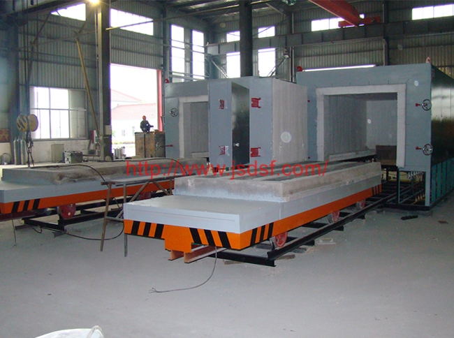 台车式回火炉是主要供一般大、中型金属或合金机件在额定温度下热处理之用的回火炉。用途:台车式回火炉,主要用于高铬铸钢轧辊回火、轧辊表面焊接修复后消除焊接应力回火及其他用途回火,属于节能型周期作业回火炉,采用微电脑程序工艺曲线自动控温柜,全自动
