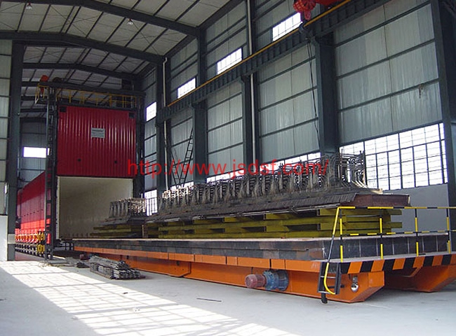 台车式燃气炉是国家标准节能型周期式作业炉,节能结构。台车采用防撞击密封砖,炉门采用弹簧式压紧机构,自动密封台车和炉门,一体化连轨,不需基础安装,放在水平地面即可使用。主要用于高铬、高锰钢铸件、球墨铸铁、轧辊、钢球、45钢、不锈钢等淬火、退火